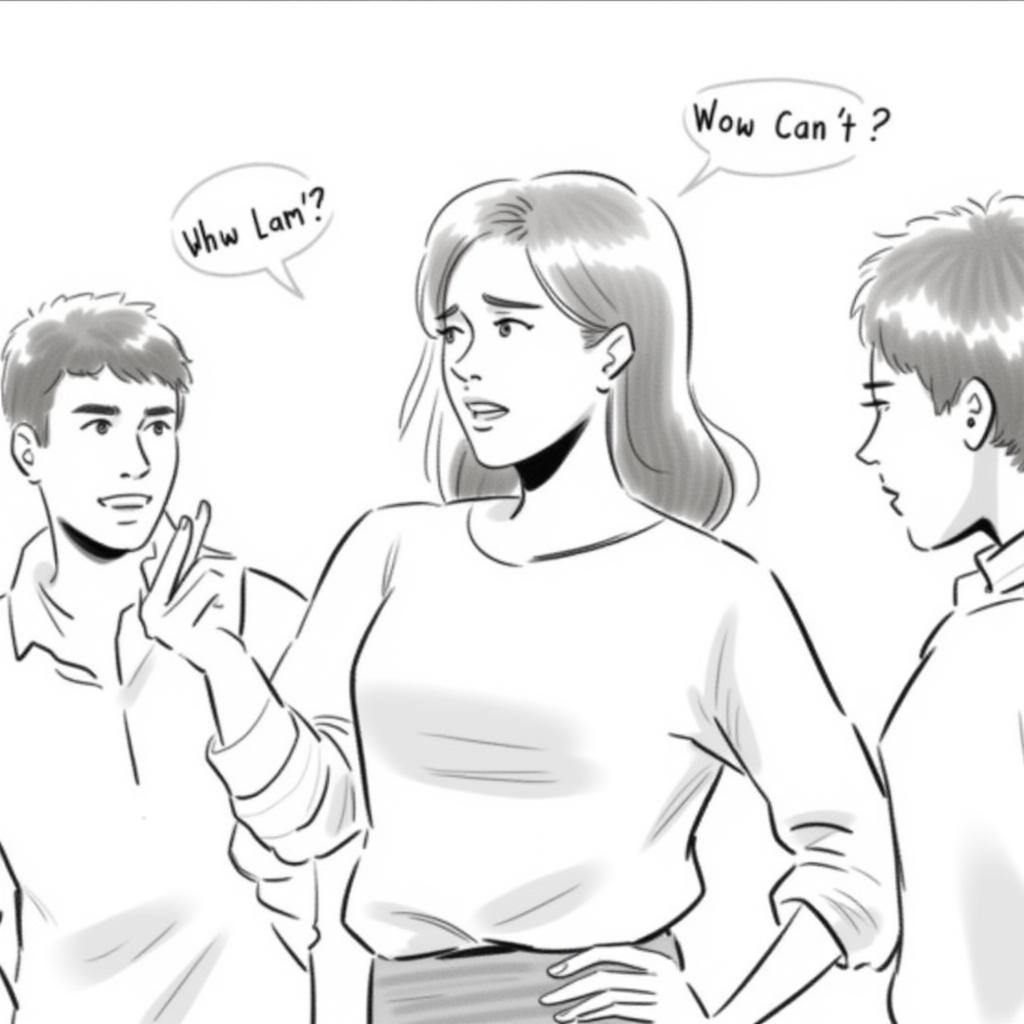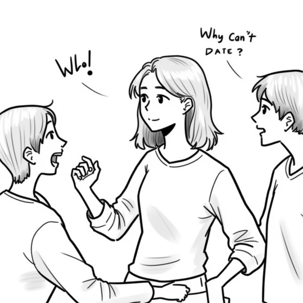 - "[trigger] black and white color illustration, one young female professor explains about why people can't date while 3~4 students in their early 30s got shocked"