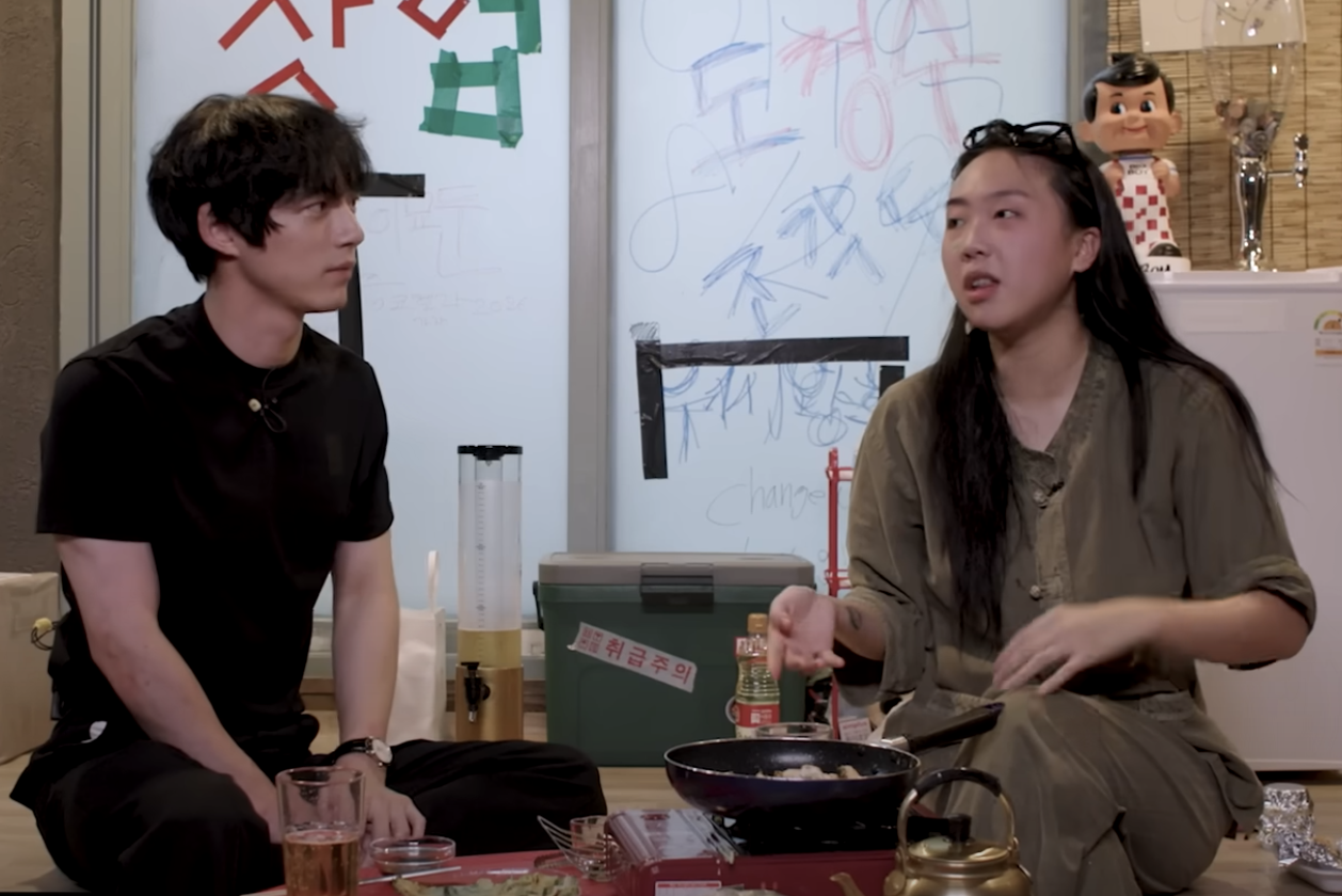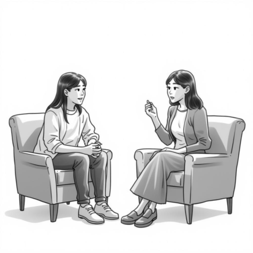 - "[trigger] black and white color illustration, one asian male in his 30s and one asian female in her early 20s sitting on the different couch talking about their life while the guy is trying to make fun of her"