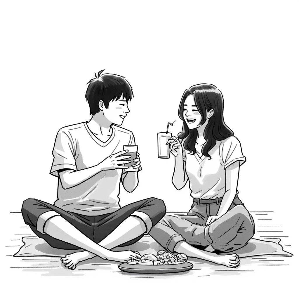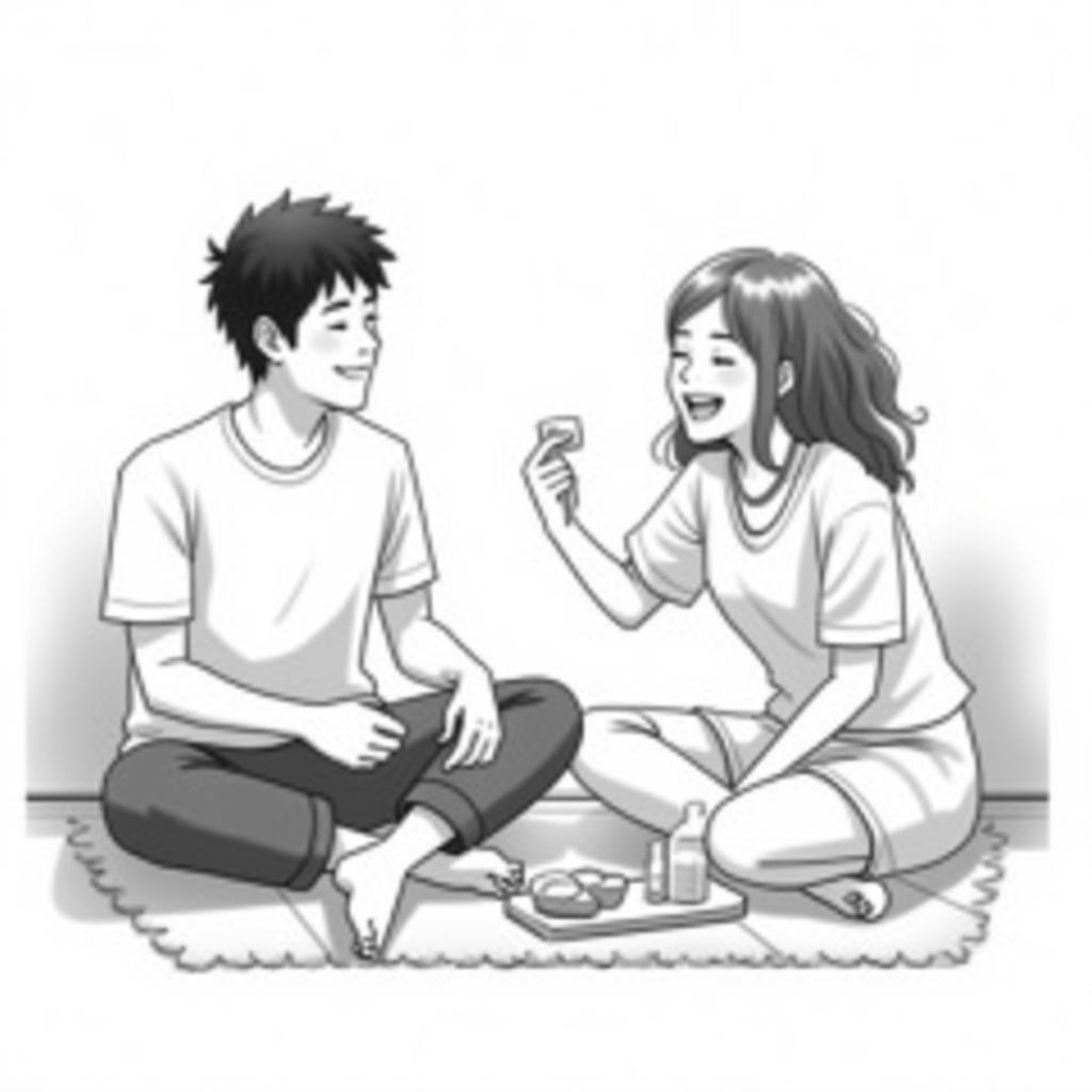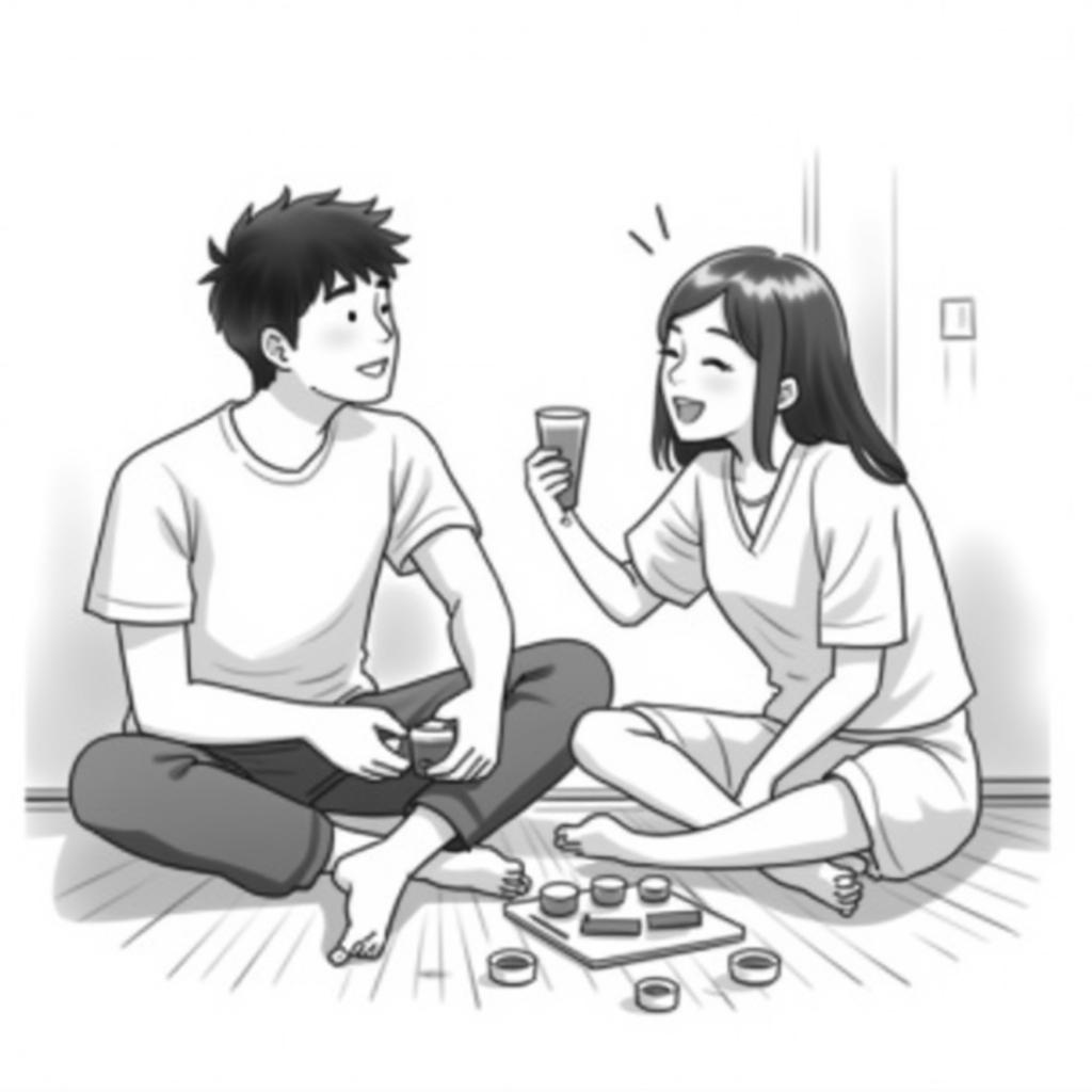 - "[trigger] black and white color illustration, An asian male in his early 20's and asian female in her early 20's are sitting on the wooden floor with some snacks, and drinking and laughing, black and white color theme"